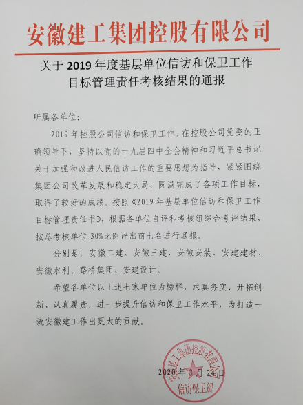 安徽二建信访守卫事情在公司党委的准确向导下,圆满完成了2019年度的各项事情使命。在集团信访守卫部组织的《2019年下层单位信访和守卫事情目的管理责任书》审核评选中荣获第一名。