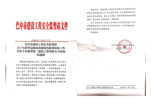 2020年5月6日,四川巴中市清静监视站对安徽二建承建的半山逸城二期项目在新冠肺炎防疫疫情防控和有序复工复产事情举行转达表扬。