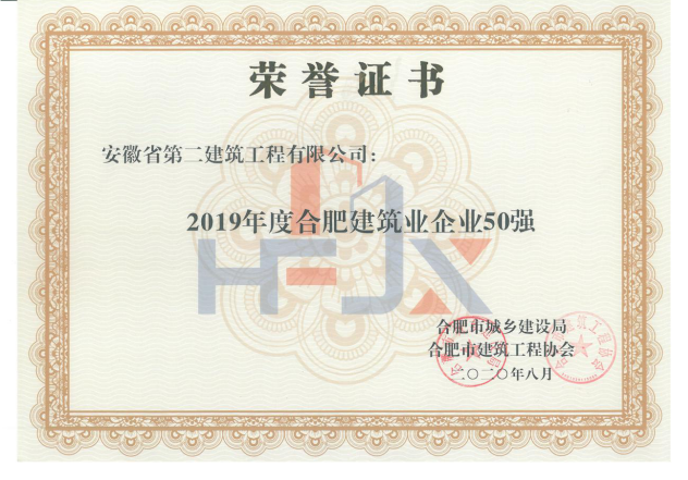 安徽二建公司荣获“2019年度合肥市50强修建业企业”等声誉