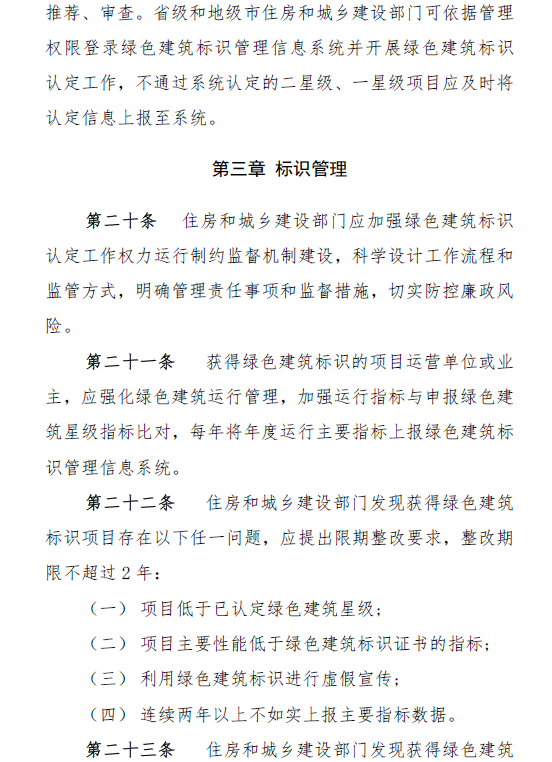 《步伐》划定,住房和城乡建设部认真制订完善绿色修建标识制度,指导监视地方绿色修建标识事情,认定三星级绿色修建并授予标识。省级住房和城乡建设部分认真外地区绿色修建标识事情,认定二星级绿色修建并授予标识,组织地市级住房和城乡建设部分开展外地区一星级绿色修建认定和标识授予事情。