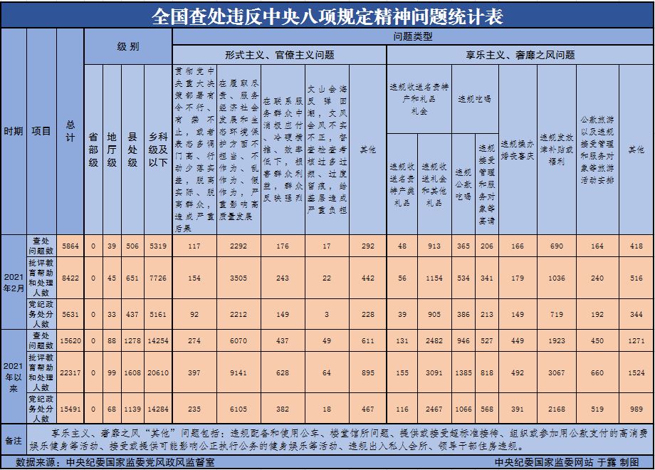 3ÔÂ29ÈÕ£¬ÖÐÑë¼Íί¹ú¼Ò¼àίÐû²¼ÁË2021Äê2ÔÂÌìϲ鴦Υ·´ÖÐÑë°ËÏî»®¶¨¾«ÉñÎÊÌâ»ã×ÜÇéÐΡ£µ±Ô£¬Ììϸ÷¼¶¼Í¼ì¼à²ì»ú¹Ø¹²²é´¦Î¥·´ÖÐÑë°ËÏî»®¶¨¾«ÉñÎÊÌâ5864Æð£¬Æ·ÆÀ½ÌÓý×ÊÖúºÍ´¦Öóͷ£8422ÈË£¬ÆäÖе³¼ÍÕþÎñ´¦·Ö5631ÈË¡£