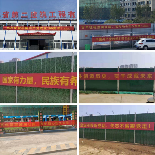 铸就百年绚烂,誊写千秋伟业。为迎接中国共产党建设100周年,六分公司机关及所属项目部纷纷悬挂张贴了有关庆祝中国共产党建设100周年的口号,营造浓重的宣传气氛,把党史学习教育进一步推向深入,鼎力大举营造“党的盛典、人民的节日”浓重气氛,充分展示中国共产党百年绚烂历程、伟大成绩和名贵履历,周全营造浓重气氛, 共庆党的百年华诞,鼎力大举唱响共产党好、社会主义好,刷新开放好、伟大祖国好、各族人民好的时代主旋律。