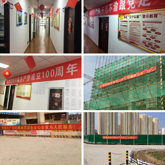 铸就百年绚烂,誊写千秋伟业。为迎接中国共产党建设100周年,六分公司机关及所属项目部纷纷悬挂张贴了有关庆祝中国共产党建设100周年的口号,营造浓重的宣传气氛,把党史学习教育进一步推向深入,鼎力大举营造“党的盛典、人民的节日”浓重气氛,充分展示中国共产党百年绚烂历程、伟大成绩和名贵履历,周全营造浓重气氛, 共庆党的百年华诞,鼎力大举唱响共产党好、社会主义好,刷新开放好、伟大祖国好、各族人民好的时代主旋律。