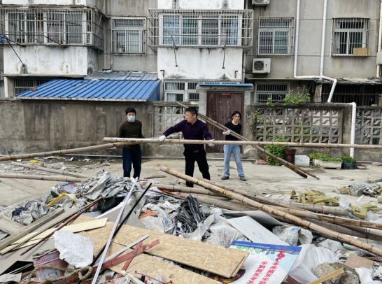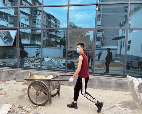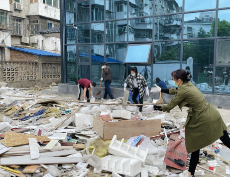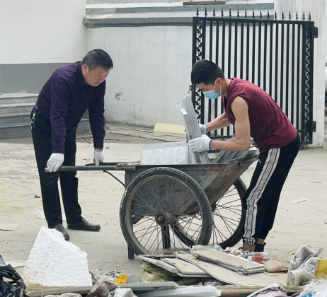 4月20日下昼,周遭劳务组织职工整理公司聚会室、食堂项目修建垃圾。