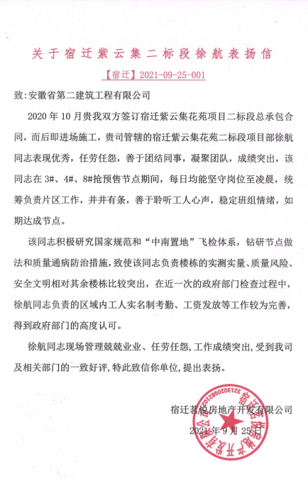 克日,第三分公司宿迁中南紫云集花苑项目的施工员徐航收到了一封业主单位发来的表扬信,通常大方潇洒的他在收到信后露出了腼腆的笑容,他体现:“这是自己的分内事情,以后会继续坚持”。